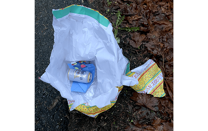 The first thing we found at the end of 112th Ave NE was a discarded bag with a single paper plate in it.