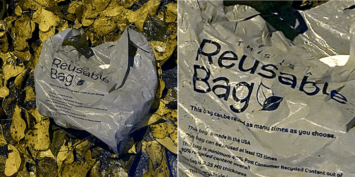 It was a reusable plastic bag with the message, “This bad can be used as many times as you choose.” They chose “once”. We added it to our garbage collection bags and we will reuse more than once.
