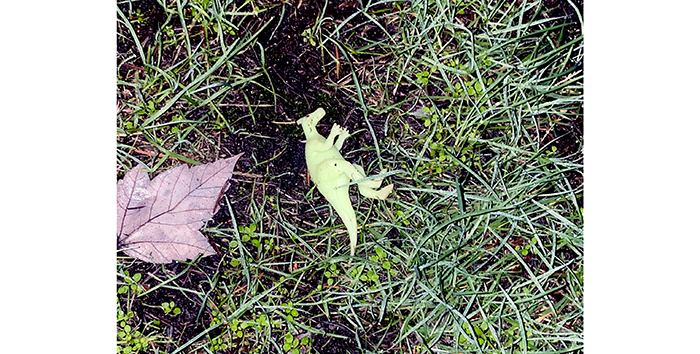 Not really, but being a dinosaur, Chuck decided to toss it over the fence himself. Embarrassingly, it took him three tries. We would show the videos, but somehow, they disappeared. And the dinosaur was much larger than it appears in the photo. Really.