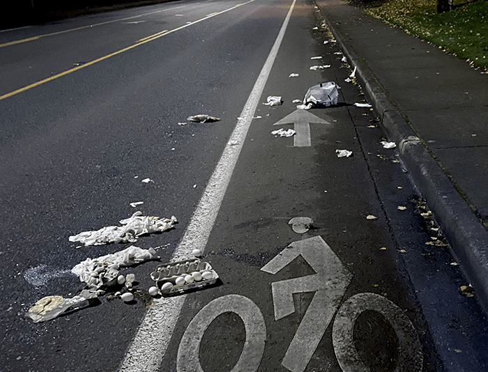 Someone evidently bought a bag of groceries, put it on the top of their car and drove off. The identifiable food groups were butter, eggs (six, count then, uncracked), half-and-half and a package of corn tortillas. There appeared to be about two packages of paper towels, but we cannot be sure. It took about twenty minutes to clean up and get to the nearest dumpster. Major downer.