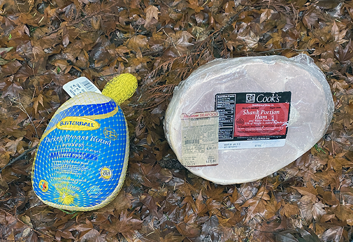 A Butterball turkey breast roast and a ham shank. These were worth major bucks; the ham shank alone was $28.15. However, they were already overly ripe, and we left them in a convenient dumpster. We tried to count this as found money, but those turkey-stupid judges didn’t allow it, the pigs.
