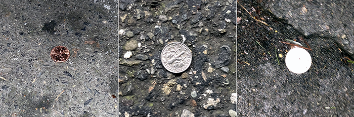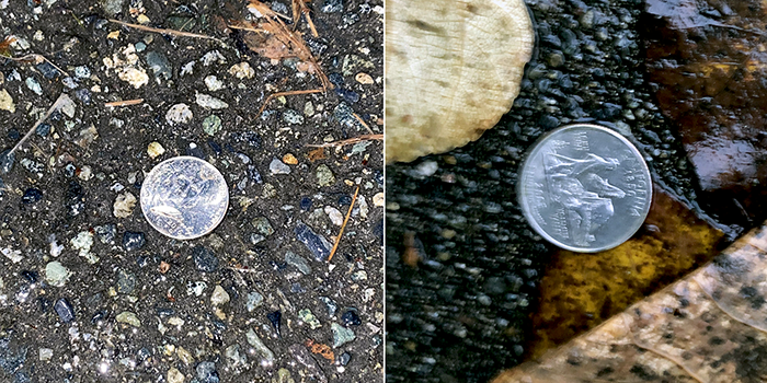 Twenty-one cents. First, Chuck found the penny and was elated that we would not be shut out this week. Then, Janet found a dime in a parking lot then another dime when she was traversing part of the route that Chuck had earlier walked. Chuck was depressed, but at least the photo of the dime was overexposed.
