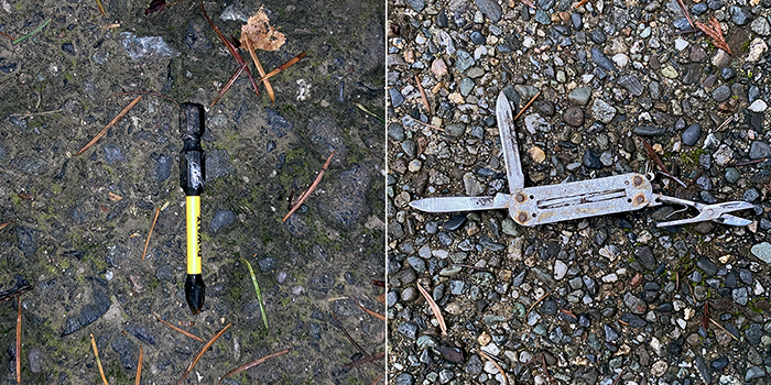 A drill screwdriver bit and a pocketknife. The pocketknife had been run-over several times but was still in reasonable condition. Two tools counted.