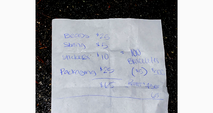 Whoa! $65 to produce one-hundred bracelets with a net profit of $435. We are in! But wait, a second. What about labor, taxes, insurance, FICA, family medical leave and a city business license. So, their net profits will be about $75.23.