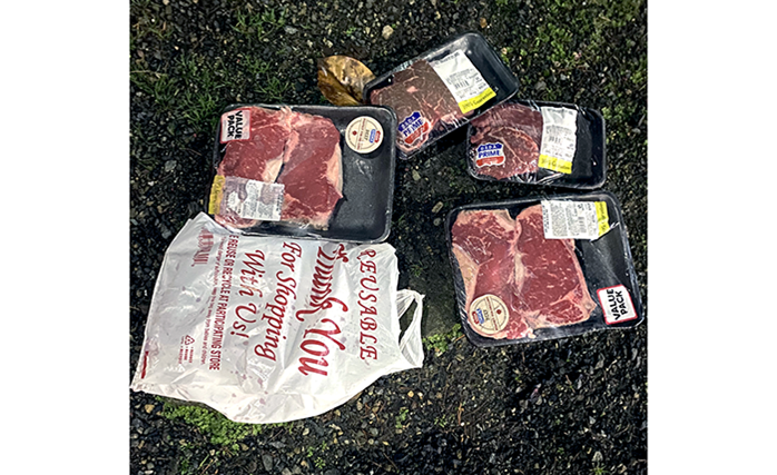 Also, in a bush across from Safeway was a bag. It was heavy and contained some unopened steaks.