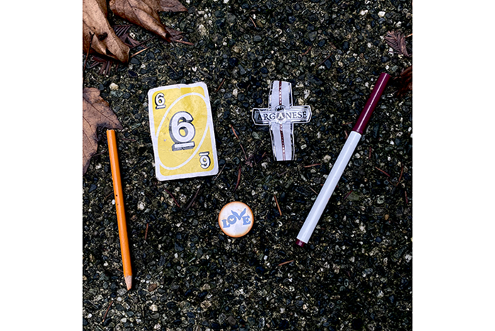 A dull orange pencil, a lost Uno card, a purple marker, an Arganese Cigar wrapper and a “Love button.” If anyone wants to try to guess next week’s items the lucky winner will receive the highest-valued item we find next week, not including any money. Please do not flood our (unpublished) telephone hotline with entries.