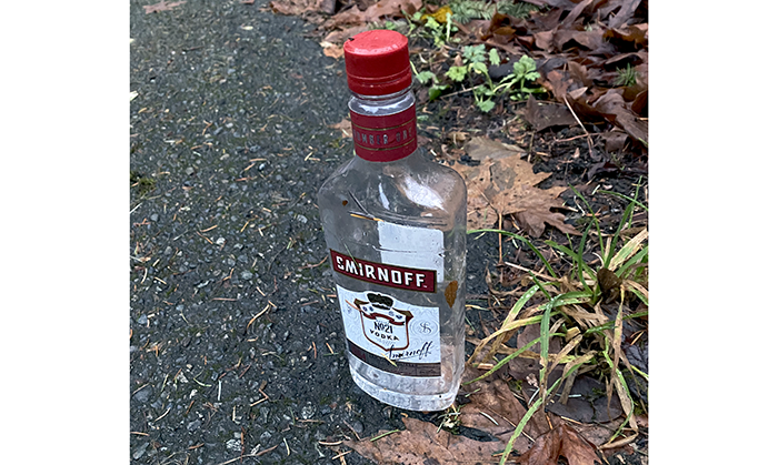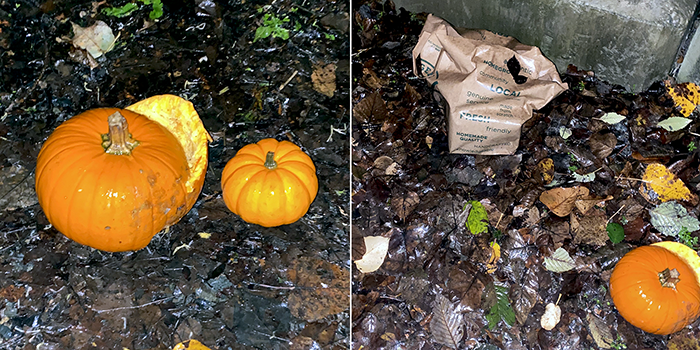 The big pumpkin was broken, and we decided to carry them to some trashcans on the other side of the lot. On the way, we found a bag with several empty beer bottles in it. It had handles so we didn’t empty it into our bags. We picked it up and proceeded toward the cans. About halfway there, the handles on the waterlogged bag broke. Again, we picked up everything and juggled pumpkins and beer bottles to the trash cans.