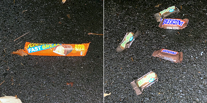 Along Juanita-Woodinville Way, we found another unopened King Size Reese’s Fast Break bar like we found a few weeks ago. We took the photo and put it in our bag. As we started to continue or our way, we noticed something in the grass and found five more unopened candy bars. This was great! It was like taking candy from a baby… or road.