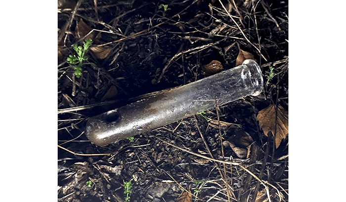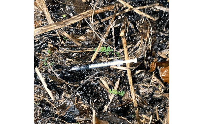 A hypodermic needle. We pressed the plunger in, and a little milky liquid squirted out. Fortunately, we had just found a beer can and was able to slip it in and bend the pop tab so it wouldn’t slip out. Later we put it on our sharps container which is about a third full now.