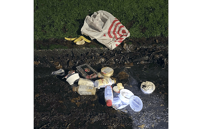 More uneaten food, mostly. They ate half the banana and half the apple. Other than those, everything else was sealed except for a few items that burst on impact. We bagged the groceries and considered carrying them up Brickyard Road hill, then thought better of it. We backtracked about two blocks and made a second trip into the apartment complex. What is with all the dumping of unopened food. Besides this, in the last two weeks, we found,