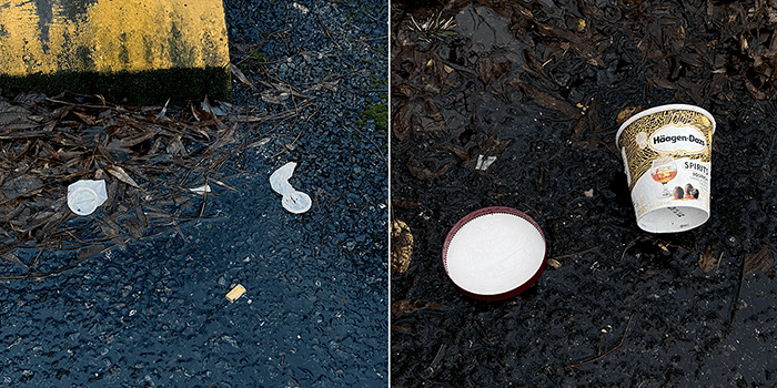 It is hard to see, but the image on the left was last week and the one on the right was today. The whole lot was a mess, but we have been cleaning up this driveway which had a pile of leaves and branches which litterers added their trash to. Now we can easily see the trash. And, yes, we picked up the cup.
