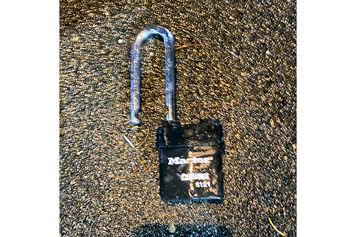 Near the Safeway parking lot, another Master lock.