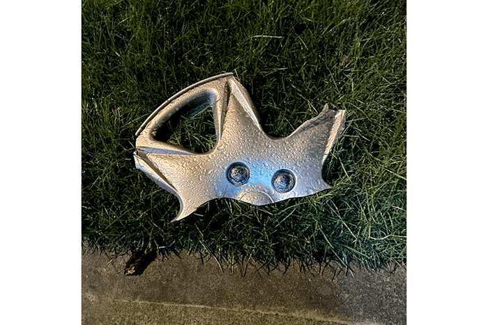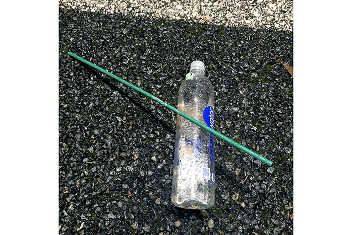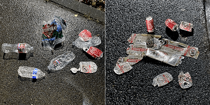 As we passed the Safeway store on the way to the bus stop, we started finding flattened water bottles.