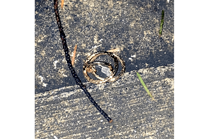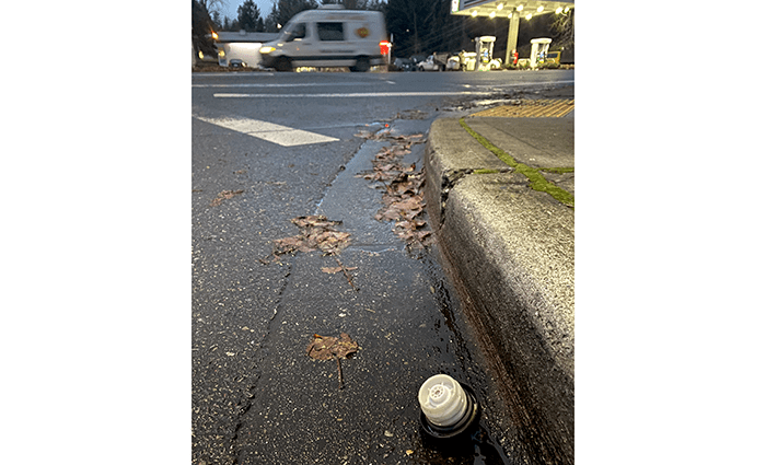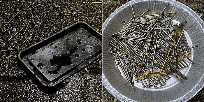 We did a good deed today. At the busy corner of Juanita-Woodinville Way and 108th Ave. NE, we found some nails and the plastic tray that had contained them. Looking around, we found more loose nails scattered across the intersection. We spent fourteen minutes gathering the nails as timed by our body camera.