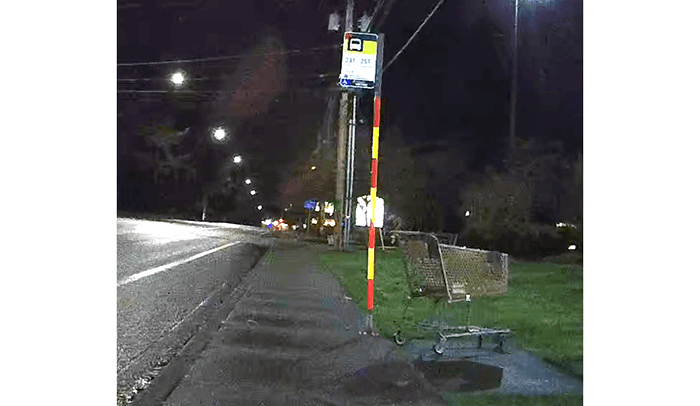 At the bus stop at Safeway, a cart left by a bus rider. It had some random trash in it that we left. But we did drag the cart into the Safeway parking lot.