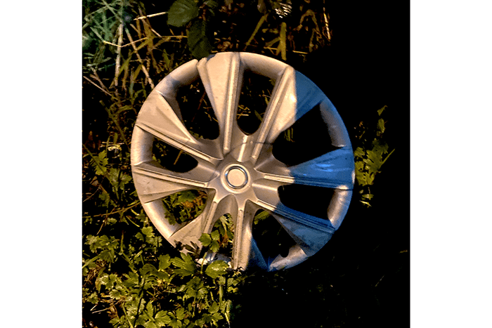 We were already carrying a waterlogged box, mechanic’s rag and towel making a heavy load. Fortunately, today is trash collection day on Norway Hill and we were able to unload the wheel cover and heavy objects about halfway up the hill.