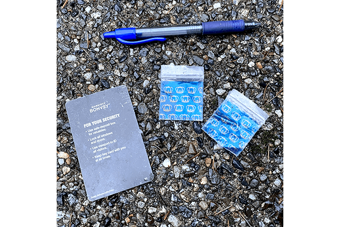 A nice gel pen, empty of course. Another hotel room card, Marriot, this time. Two empty dime bags. No, Chuck found them, really.