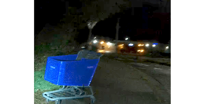 This morning it was a Goodwill cart near the Goodwill store in the background on 100th Ave NE. We drug it back to the store. We always feel awkward dragging a shopping cart along with us wondering how many passersby think we are homeless. At least it was empty.