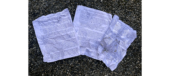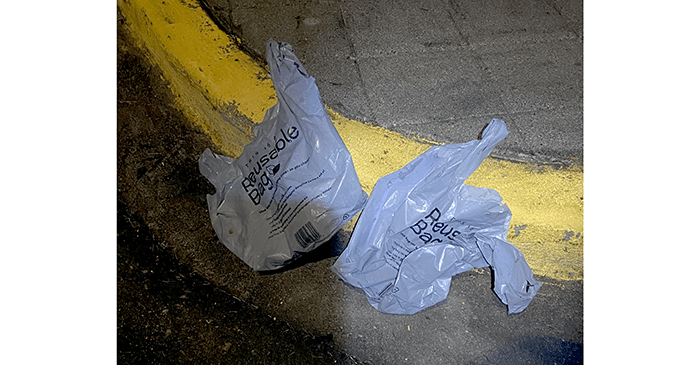 In the middle of the street, someone tossed two perfectly good reusable plastic bags.