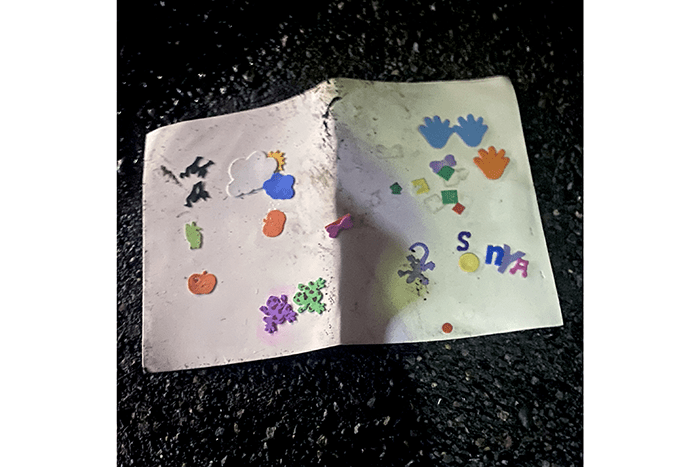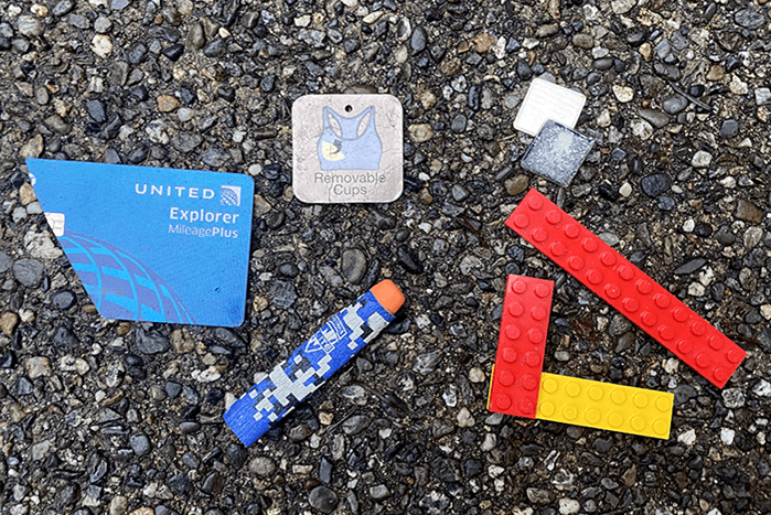 A Nerf bullet, but it was very flat and will not fit in any nerf weapon. Half a United Explorer credit card. The name was not unique enough to allow us to track it down, so we shredded it. A tag for removable cups. This was a “what?” for Chuck. Some Legos that, because of the colors, scream “McDonalds Happy Meal Toy” but we did not find a match. Finally, in the upper-right, a badly run-over lapel pin or tie tack. We could try to polish the plastic cover to determine what the image is, but it would probably be disappointing and waste our time.