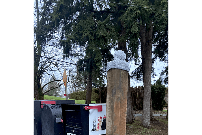 We have seen the poster over the mailbox with the cats wearing hats, but now the post is wearing a hat. We have no idea what this means. And, we might add, don’t care.