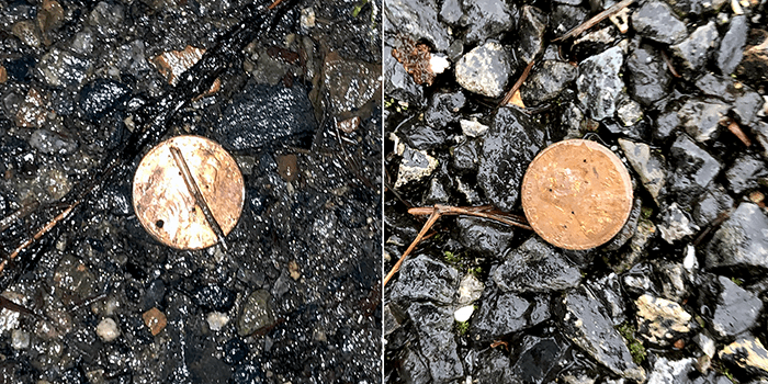 It took about five trips and five minutes to pick up all the pieces waiting for breaks in traffic. The tube contained construction adhesive and was stuck to the road. Is this what they call ‘being stuck in a rut’?