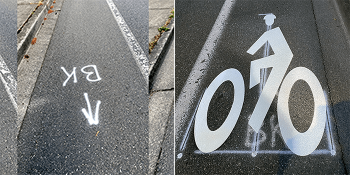 Over two years later, bicycle lane paint symbols were added at each BK symbol. We were impressed with the care and precision with which they were applied. Today, a mere four months later, we noticed several of them are breaking up.