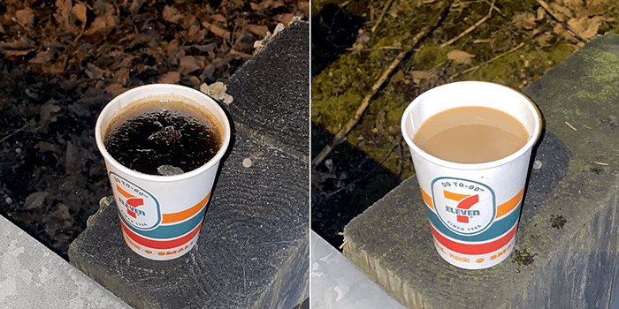 Today, we found another 7-Eleven coffee cup on the guard rail. No ice.