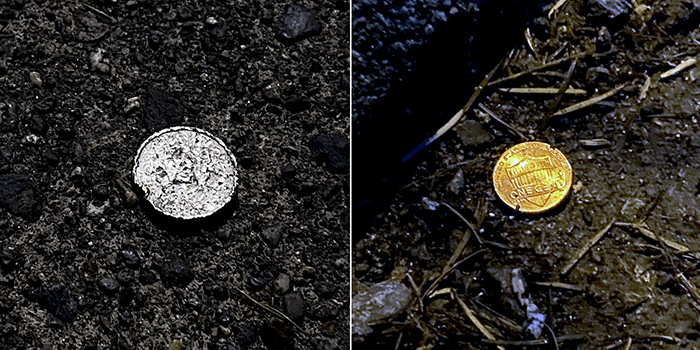 Two pennies near where a food truck parks, a dime in a parking lot and a nickel and penny in the park-and-ride. Eighteen cents.