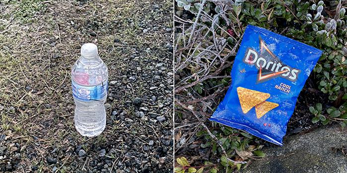 An unopened bottle of water on Riverside Drive. Janet decided it was best to open it and pour it out. We did. Later, at the park-and-ride, an unopened bag of Cool Ranch Doritos. A nice bottle of water would have been good at that point.