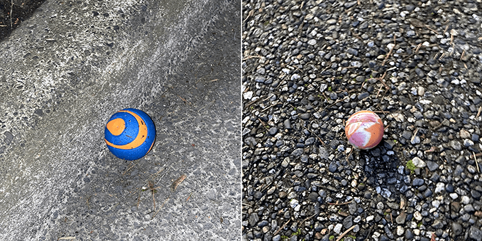 A soccer ball was at the bottom of the Brickyard Road hill and looked like it had a very rough trip down. We put it out of its misery. Then we found a dog ball. What the… What’s a dog ball doing outside of a tennis court? Has someone trained a dog to play tennis?