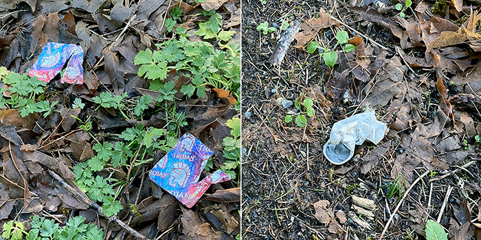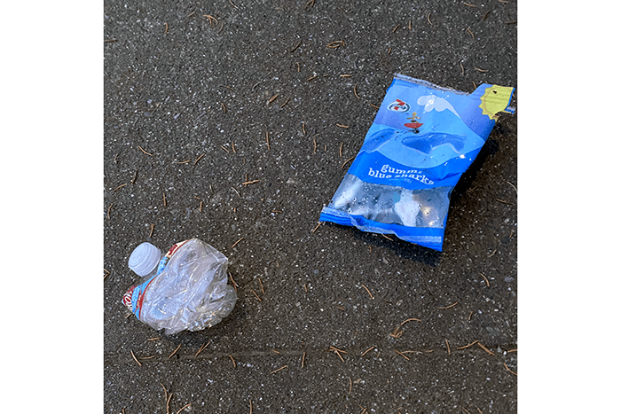 We found no Bud Light cans. We did find one water bottle and half a bag of gummi blue sharks. We hope the beer drinker was off this week and hasn’t switched to gummi blue sharks. What is the difference between gummi bears and gummi blue sharks anyway?