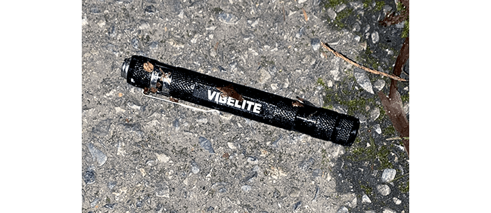 The head was gone which may be why it was discarded. We found it on Amazon for Seventeen bucks. It is powered by four LR-44 batteries. Real flashlights use 18650 rechargeable batteries.