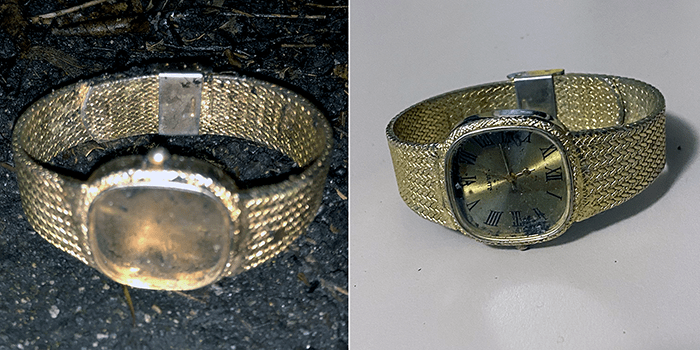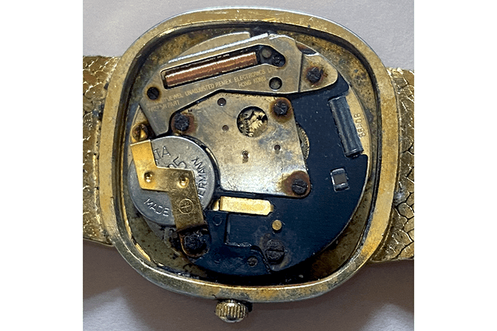 However, the movement is labelled, “One (1) Jewel unadjusted Remex Electronics Ltd Hong Kong.” There are some hits on the web for this manufacturer, mainly stating that they are cheap and from the ’50s to ’70s. Note that there is rust around the screws, so it was probably in the park-and-ride for a while.