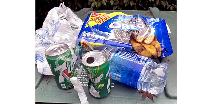 It was mostly empty wrappers, but there was a mostly-full bottle of water and a full 7-Up can. If we had opened it earlier, we could have dumped the liquids and had a lighter load.