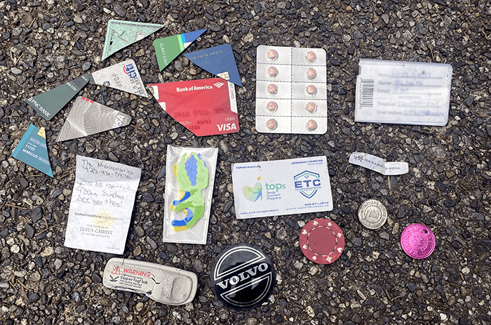 Since we missed last Friday, this is almost two weeks’ worth of accumulation. Several pieces-parts of credit cards. Again, no matches; an unopened pack of antacid pills; a student’s ID; an invitation to an LDS Stake House; a pack of kids’ flossing tools; and a business card for a tennis outreach program.