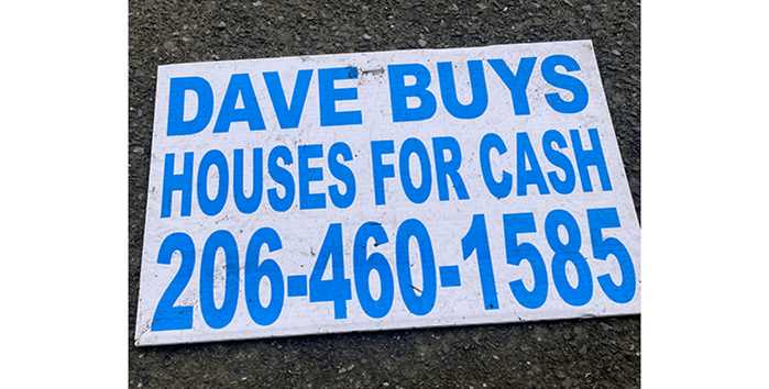 These appeared a few weeks ago. We have researched these types of signs and they are a scam. They obviously look for people who for one reason or another need to sell their home fast. They show up and offer a “good” base price. Then they do an inspection and find repairs that need to be made and deduct inflated repair costs from the price. If the seller agrees, “Dave” purchases the home, performs the cheapest minimal repairs and sells the house at a big profit. We need to get some “Scam” stickers.