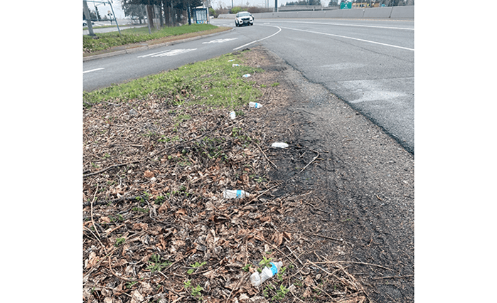 After walking up Brickyard Road, down the freeway northbound off-ramp and down the southbound on-ramp, we were overloaded with trash. As we approached the bus stop where we would normally unload, we came upon several empty water bottles.