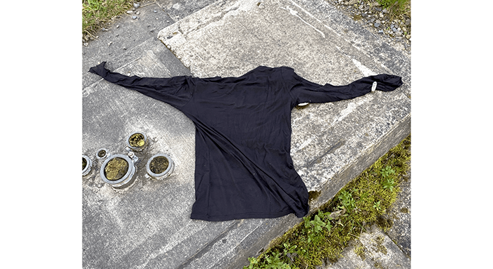 Today started out clear and chilly at 37°F (2.8°C), but by the end of the day, the temperature reached a very nice 75°F (24°C). Unfortunately, we found no money, but we found some clothing. First, at the bus stop at the freeway entrance, a shirt.