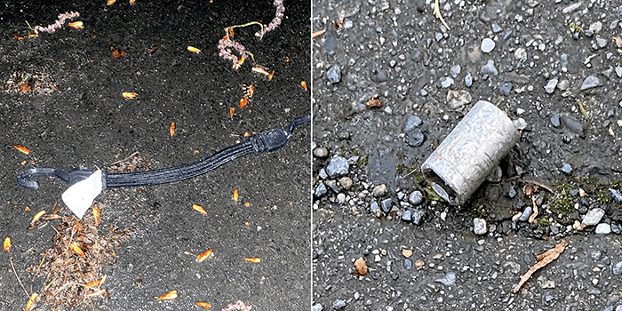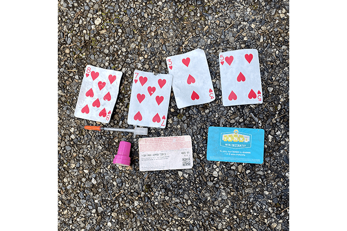 A hypodermic needle that we found today. Ordinarily it would be placed in a recycled bottle, but we did not have any at the time, and it was still capped, so it got placed in the vest pocket.