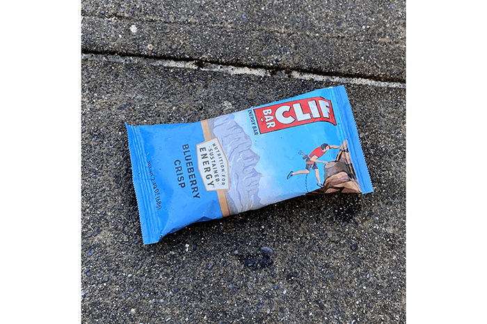 An unopened Clif Bar. It is interesting that their package has a picture of a rock climber attempting to remove a bar from the bottom of a cliff. Anyway, we did not trust it and it got tossed.