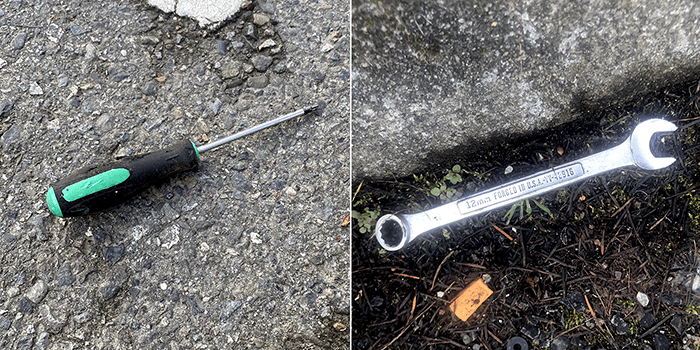 On Brickyard Road, a six-lobe screwdriver in the middle of the road, relatively unscathed, but relatively useless. Then, at the park-and-ride, a 12mm Craftsman combination wrench in great condition and mildly useful. Both will be added to our found tool collection.