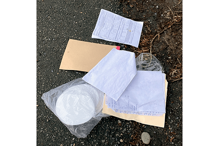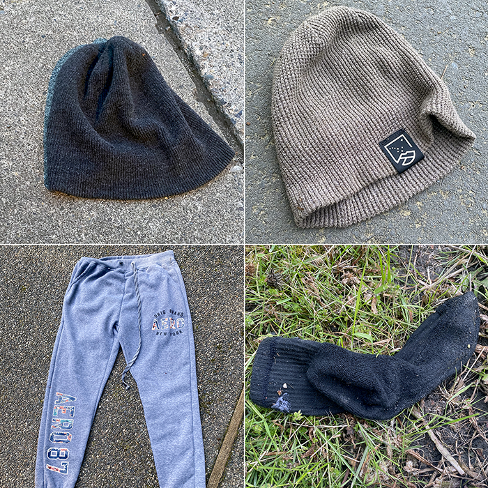 An athletic beanie. A sports bra and tank top and the tank top still had the antitheft tag attached. Another pair if sweatpants, the second this week. A pair of trousers across from the apartments on Woodinville Drive. The pants looked soiled, but we were wearing gloves. As we picked them up, sixty-seven cents fell out of the pocket.