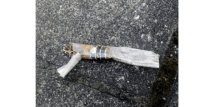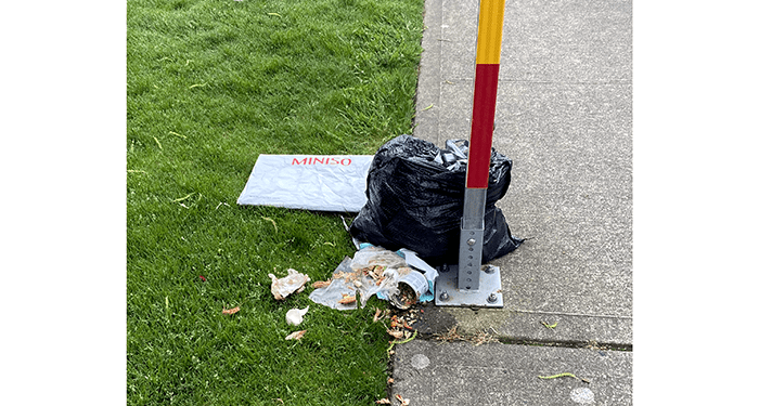 We came across a bag of garbage at a bus stop.