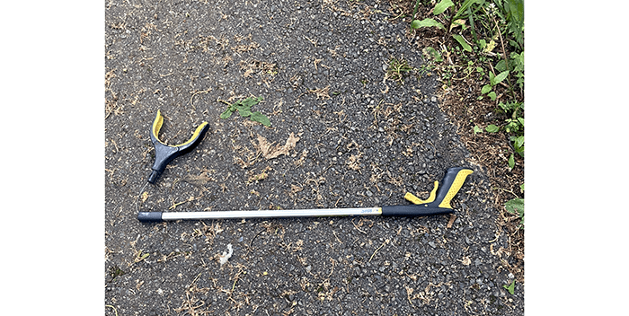 Today it was a bucked of red stain with wet rags. We used our pickers to lay the rags out so they would dry by next week when we pass this way again. And, yes, our picker pinchers are now red.