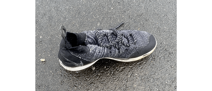 Near the bus stop, a kid’s shoe.