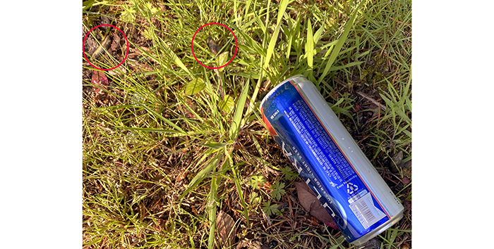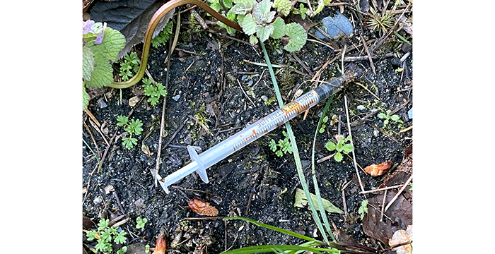 This one had been in the bushes for quite a while. We put it in a bottle and disposed of it in our sharps container at home.