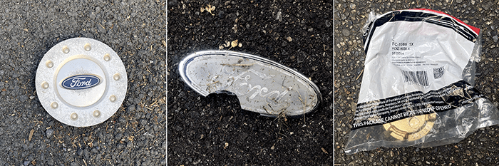 Today, we found two lost Ford emblems and a lost Ford fuel cap. The fuel cap was still in the packaging. So the guy lost his fuel cap, went to the store and bought a replacement then lost the replacement. This is no twenty-dollar gas cap, it runs about a hundred bucks.