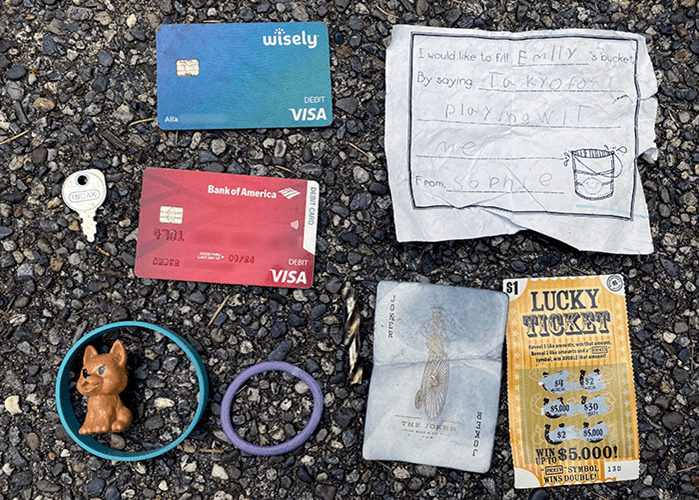 Another hairband and a “Protect our Pets” wrist band, protecting a cat. A universal lawn mower starter key. Alla’s and Amber’s debit cards. Sophie’s note to fill “Emlly’s” bucket by saying, “Tak yo for playing wit me.” A broken drill bit. A joker playing card that is worth more than the Unlucky Lottery Ticket.