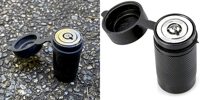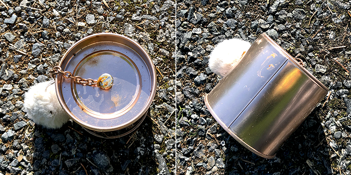 At the park-and-ride, we found a copper-colored can with a chain on the lid and a small fluffy ball on the chain.
